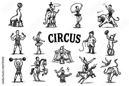 Naklejka premium Vintage circus performers and animals in engraving style, Transparent Background