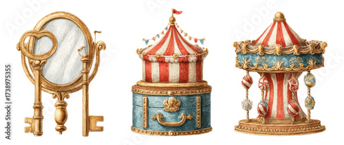 Fototapeta premium Vintage Circus Props with Mirror, Tent, and Carousel Design