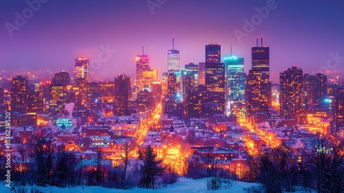 Obraz premium Vintage city skyline, skyscrapers bathed in neon, with streets below bursting...