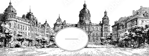 © Artem, Fototapeta premium Vintage city skyline with ornate frame for retro designs