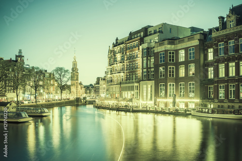 © firewings, Fototapeta premium Vintage Cityscape with Night Lights in Amsterdam