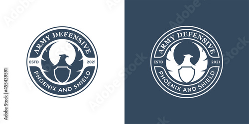© Agung, Naklejka premium vintage classic badge with silhouette phoenix or eagle and shield icon for army defender logo design