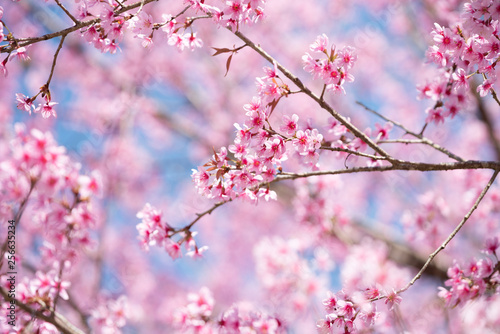 © chachamp, Fototapeta premium Vintage close up Wild Himalayan Cherry blossoms (Prunus cerasoides) blooming on tree with blue sky