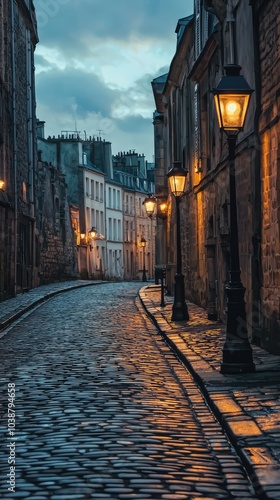 Fototapeta premium Vintage Cobblestone Street at Dusk with Lanterns