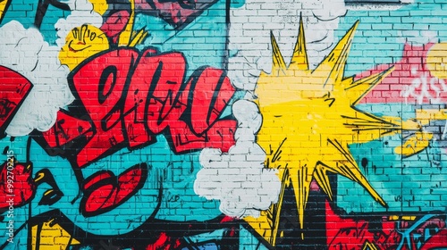 © J, Obraz premium Vintage comic-style graffiti wall, street art with retro comic book panels