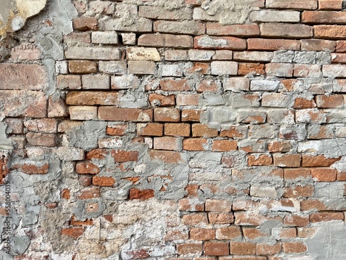 © Tetiana, Fototapeta premium Vintage cracked bricks wall with cements texture. Bricks urban background