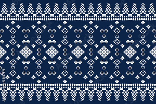 © BigSaturn , Fototapeta premium Vintage cross stitch traditional ethnic pattern on blue background. floral pixel art embroidery.Elegance background abstract Aztec seamless pattern for fabric,cloth,dress,carpet,curtain,sarong,batik.