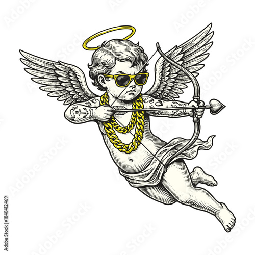 © Vecster, Naklejka premium Vintage Cupid with Sunglasses and Gold Chains