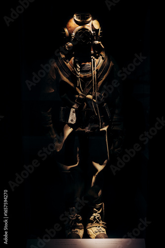 © luengo_ua, Fototapeta premium Vintage Deep-Sea Diving Suit Displayed in Dark Background