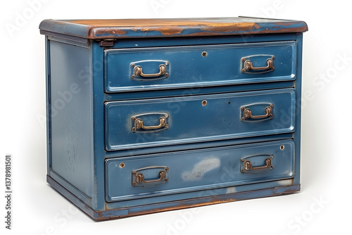 © imagemir, Fototapeta premium Vintage distressed blue metal chest of drawers with three compartments, showcasing a nostalgic charm.