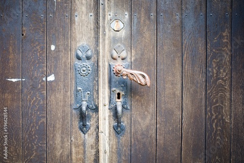 Fototapeta premium Vintage door handles. Old wooden front door with antique handle.