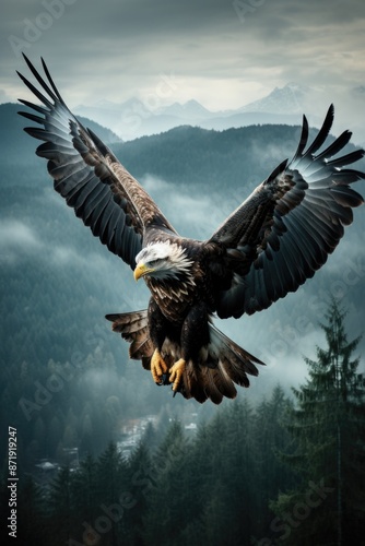 Obraz premium Vintage Eagle Nostalgic flight over fog covered, generative IA