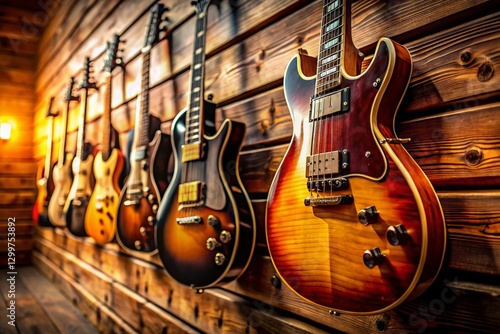 Naklejka premium Vintage Electric Guitars on Rustic Wooden Wall, Warm Lighting - Stock Photo