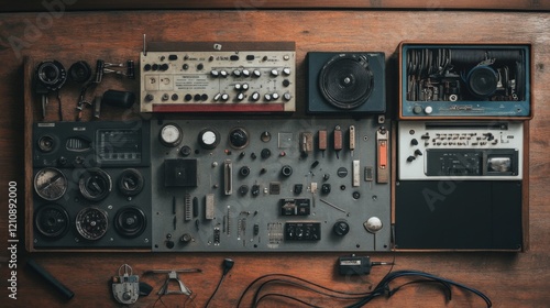 Fototapeta premium Vintage electronics and audio equipment arranged on a wooden surface.