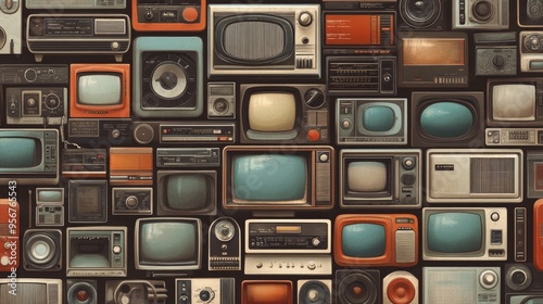 Obraz premium Vintage electronics, including televisions and radios, arranged in a seamless pattern. The image creates a nostalgic, retro-themed backdrop with rich textures.