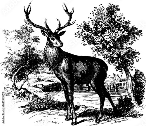 © Artem, Fototapeta premium Vintage engraved illustration of a majestic wild deer in natural landscape