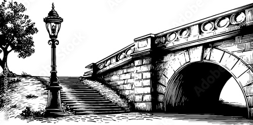© Artem, Fototapeta premium Vintage engraved illustration of stone arch bridge with lamp post and tree in retro style for design