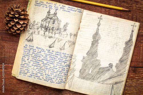 © MarekPhotoDesign.com, Fototapeta premium vintage expedition journal on rustic wood