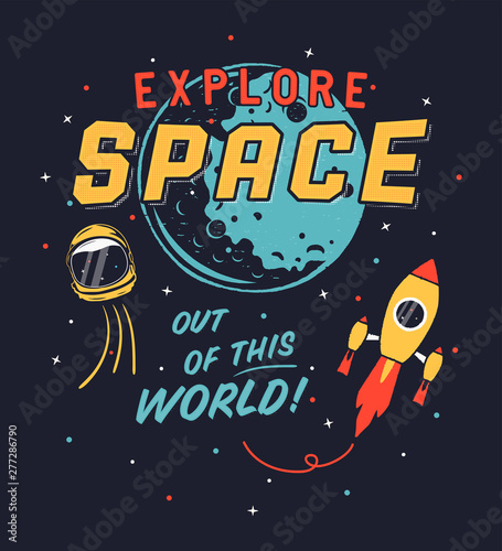 © jeksonjs, Naklejka premium Vintage Explore Space graphic for t shirt, poster. Space propaganda design with spaceship, shuttle, helmet and moon. Retro style rocket and stars. Stock vector background illustration