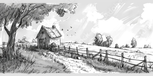 © Murda, Fototapeta premium Vintage Farmhouse Sketch in Monochrome