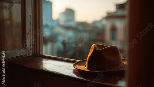 © Ilwa, Obraz premium Vintage Fedora on Windowsill, Cityscape View