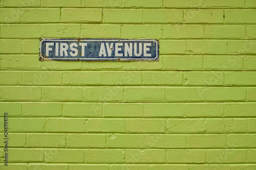 Obraz premium Vintage First Avenue street sign, on a green painted brick wall. Sign is old...