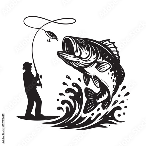 Fototapeta premium Vintage Fisherman Catching Big Bass – Black and White Fishing Vector...