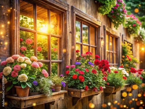 © Danicha, Fototapeta premium Vintage Flower Decorated Windows: Bokeh Effect Stock Photo
