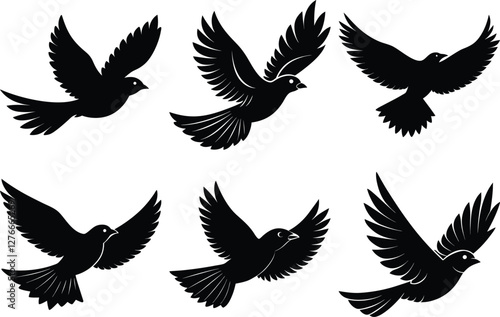 © vectorart092, Obraz premium vintage flying bird silhouette set, drawing birds black silhouette