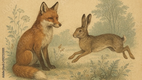 © Rawpixel.com, Fototapeta premium Vintage fox hare nature desktop wallpaper