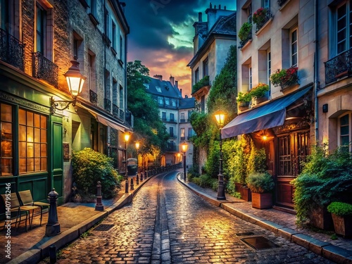 Fototapeta premium Vintage French Poster: Low Light Parisian Street Scene - Retro Travel Photography