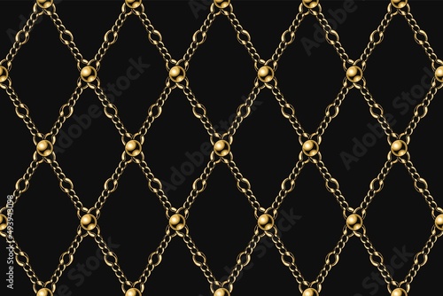Fototapeta premium Vintage geometric gold pattern with metal chains and beads. Rhombus grid on a black background.