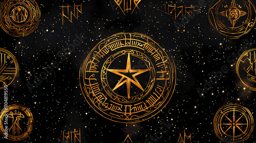 © Thiago, Naklejka premium Vintage golden runic symbols on black starry background. Runic. Illustration