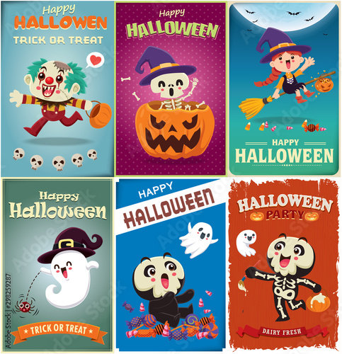 © Sze Wei Wong, Fototapeta premium Vintage Halloween poster design with vector clown, witch, skeleton, ghost, spider, pumpkin, character.