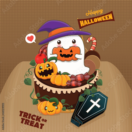 Obraz premium Vintage Halloween poster design with vector ghost, pumpkin character.