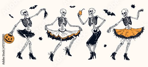 © Irina Khovanskaya, Naklejka premium Vintage Halloween vector set with skeletons in skirts and heels, pumpkin bag with glass, flying bats. Hand drawn silhouette collection in black and orange accent style
