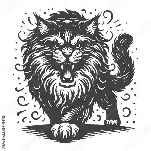 Obraz premium Vintage Hand-Drawn Maine Coon Roaring Illustration – Fierce Wildcat Engraved...