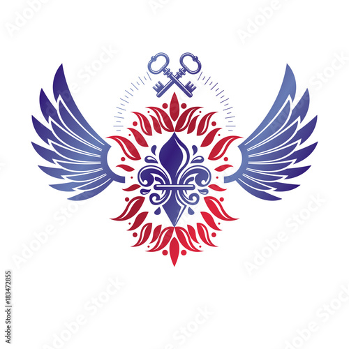 © Sylverarts, Fototapeta premium Vintage heraldic vector insignia composed with lily flower symbol and security keys. Royal guard theme illustration, winged design element.