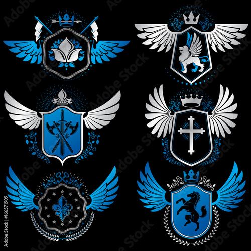Fototapeta premium Vintage heraldry design templates, vector emblems created with bird wings,...