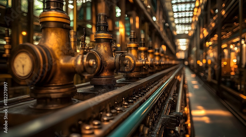 Fototapeta premium Vintage Industrial Machinery: Gears, Valves, Pipes, and Precision Engineering in a Factory Setting