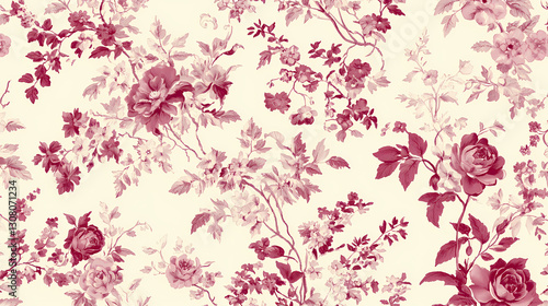 © Thiago, Obraz premium Vintage inspired seamless toile de jouy pattern featuring intricate floral designs in shades of pink on soft cream background, evoking classic and elegant aesthetic. Timeless - Garden. Illustration