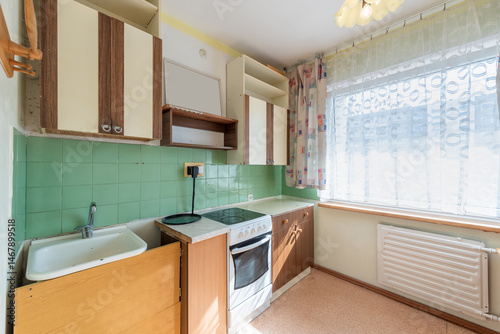 © Mindaugas Dulinskas, Fototapeta premium Vintage Kitchen with Old Cabinets and Bright Window Lighting