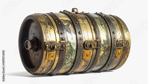 © Chalita, Obraz premium Vintage large metal steam powered engine displayed on white background for historical and industrial representation