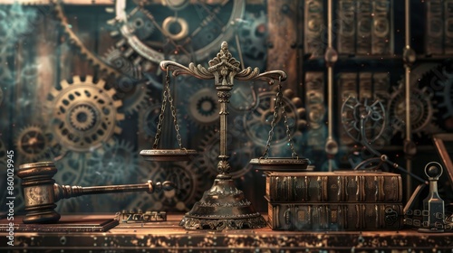 © WACHI, Fototapeta premium Vintage law office with scales of justice, gavel, and antique books surrounded by gears, representing law and industry.