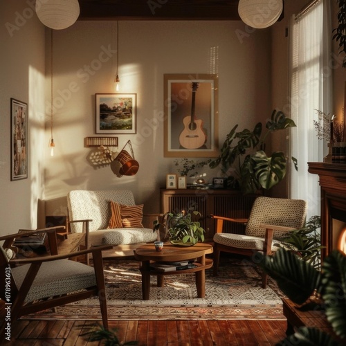 © somchit, Fototapeta premium Vintage living room with cozy vibes and warm lighting