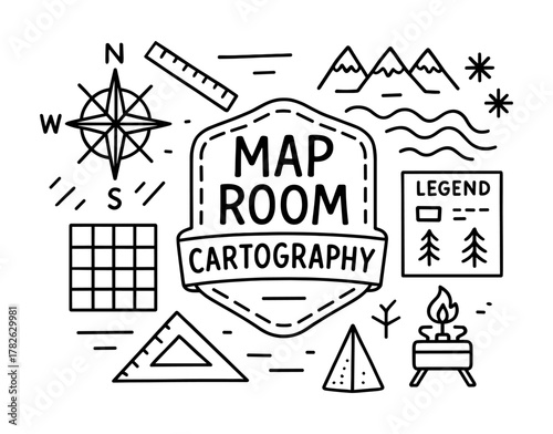 © LOBSTER LARRY, Fototapeta premium Vintage map icons: compass, mountains, and cartography elements in linear style