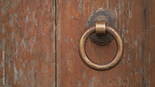 Fototapeta premium Vintage Metal Door Knocker on Weathered Wooden Door with Rustic Charm and...