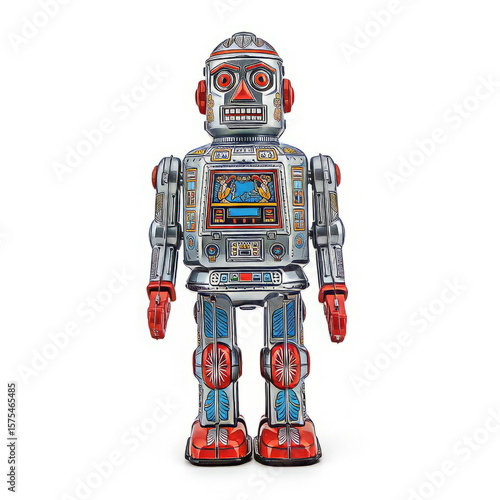 © Wardiyan, Fototapeta premium Vintage metal toy robot standing upright, featuring red, blue, and silver colors on a white background.
