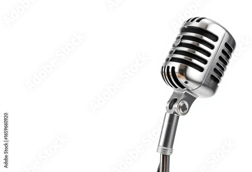 Obraz premium Vintage microphone, chrome finish, isolated on pure white background, karaoke, broadcast