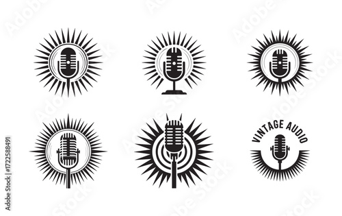 Fototapeta premium Vintage Microphone Icons with Sunburst Design. Microphone icon symbol. Vector...